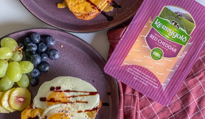 - Slå æggene ud i en skål og pisk dem let sammen med 2,5 dl. vand. Tilsæt fløde, Kerrygold cheddar, salt og peber og pisk herefter æggemassen sammen.
