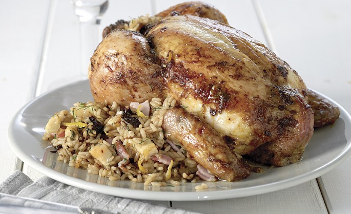 Κοτόπουλο γεμιστό με ρύζι, δαμάσκηνα και Kerrygol Kαπνιστό