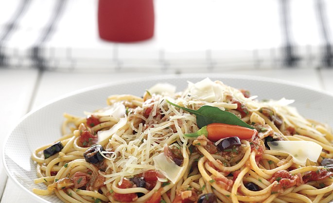 Σπαγγέτι με ντομάτα, κρεμμύδι, μπέικον, ελιές και Kerrygold Regato Light