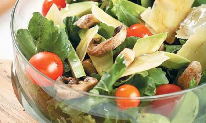 Σαλάτα με ρόκα, ντοματίνια, μανιτάρια, αβοκάντο και Kerrygold Imokilly Regato Classic
