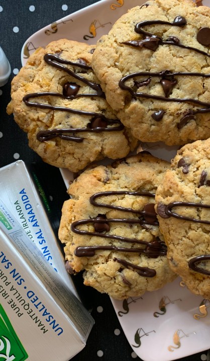 - Agrega la mantequilla Kerrygold derretida, la leche, el extracto de vainilla y las pepitas de chocolate. Bate hasta que no quede ninguna parte de harina seca.