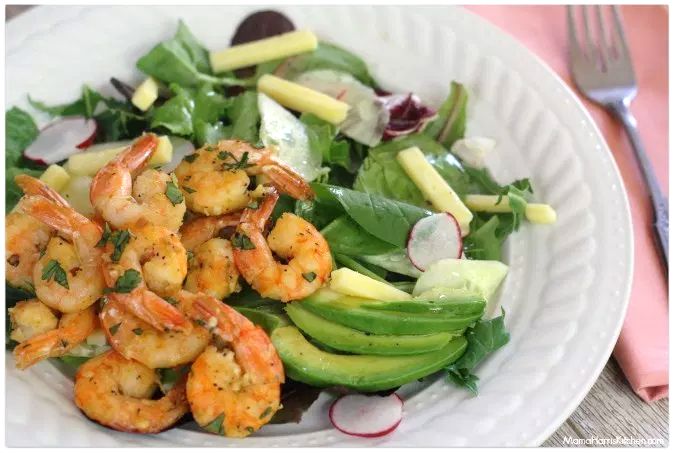 - Cucumber Radish Salad – pairs particularly well with garlic butter shrimp or prawns. To make the salad, simply combine 1 cup salad mix with 8 slices cucumber, 2 small radishes, 1/4 medium avocado, 50-80g Kerrygold Gouda cheese and a lime vinegar dressing. To make the dressing, combine the juice of 2 limes with 2 tablespoons extra light virgin olive oil, 1/2 teaspoon white wine vinegar and a sprinkle of salt and pepper. Recipe credit: mamaharriskitchen.com
