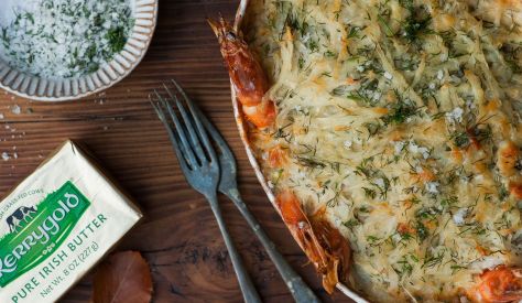 3. Using a mandolin, finely slice the potatoes. Use a little Kerrygold butter to grease an oven-proof dish, then layer the potatoes in the dish. Sprinkle some sea salt, parsley and thyme after every layer, then pour the cream / cheese sauce over the potatoes.